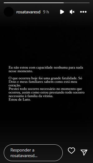 “O que ocorreu hoje foi ima grande fatalidade, só Deus e meus familiares sabem como está meu coração”, escreveu. Nas imagens é possível ver que ela entraria à esquerda em outra rua, quando a moto do personal vem pelo lado, bate no carro e ele é arremessado.