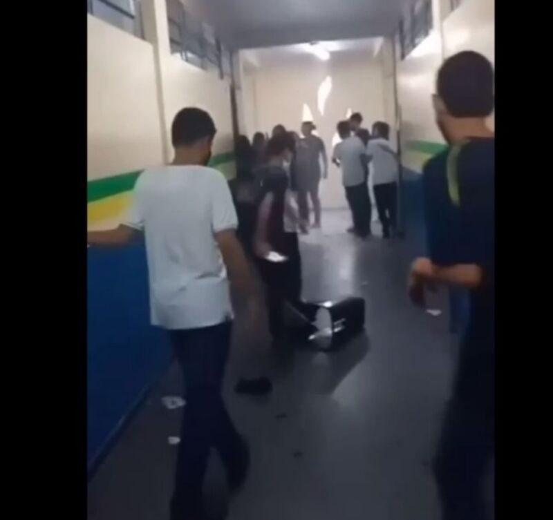 Nos vídeos divulgados, alunos aparecem destruindo lixeiras, quebrando as cadeiras e usando extintor de incêndio nos corredores e salas, promovendo uma verdadeira balbúrdia dentro do ambiente escolar.