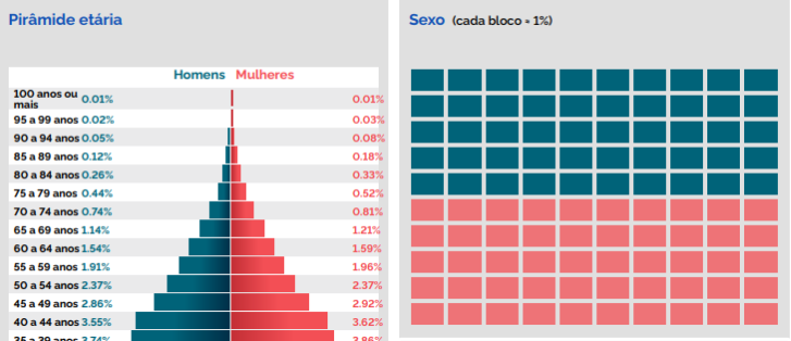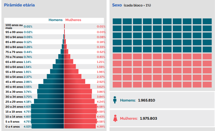Na pirâmide etária, os homens entre de 5 e 9 anos e de 5 e 19 anos formam o maior percentual, com 4,75% do universo dos habitantes. Entre as mulheres, a maior fatia se concentra na faixa entre 15 e 19 anos, com 4,59% e entre 5 a 9 anos e 20 a 24 anos, ambos com 4,58% do total.