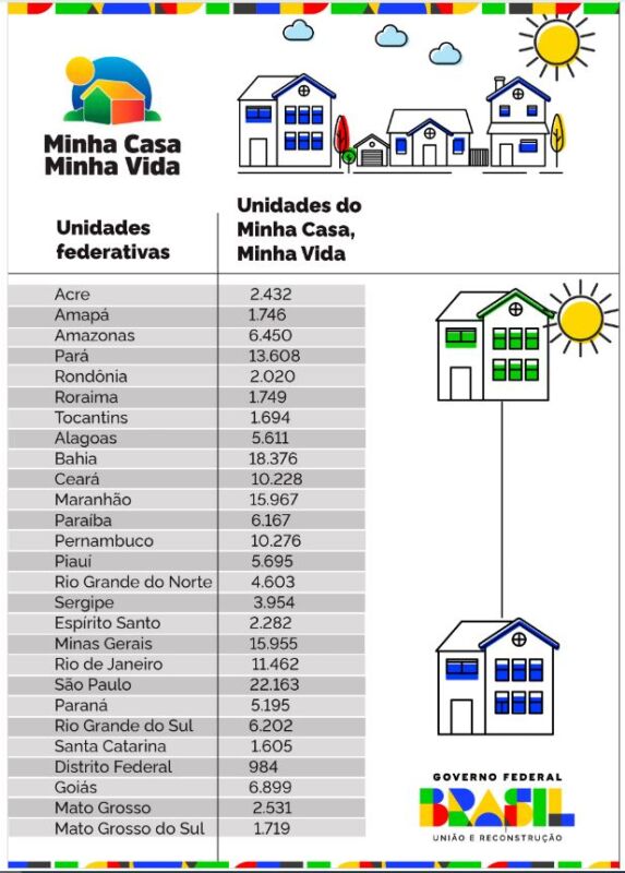 No país inteiro, foram selecionadas 187,5 mil novas unidades habitacionais do MCMV para famílias da Faixa 1. São mais de 1.200 empreendimentos que beneficiarão 560 municípios nas cinco regiões e nas 27 Unidades Federativas. Do total, 184 mil unidades são destinadas a famílias integrantes dos cadastros habitacionais.
