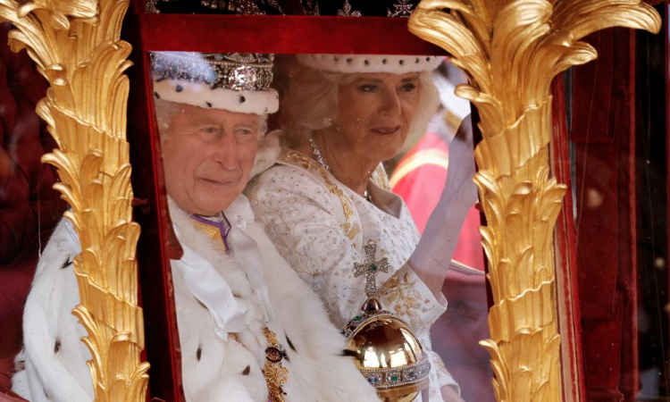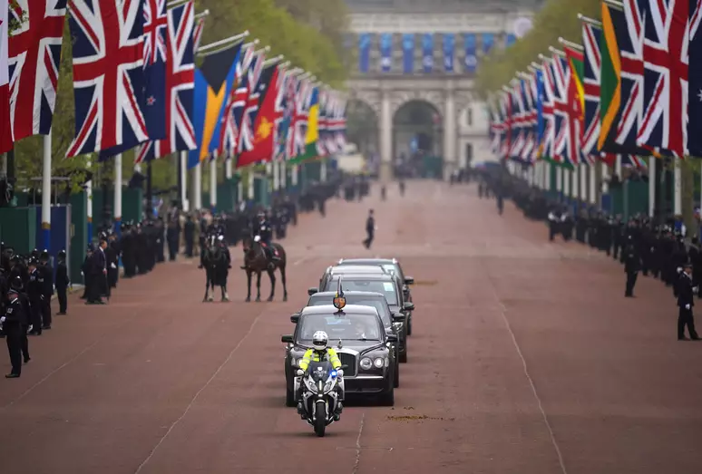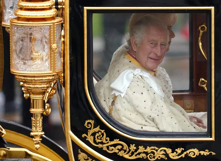 Após a cerimônia de coroação, o rei Charles III e a rainha Camilla deixaram a Abadia de Westminster em uma procissão acompanha por 4 mil soldados e 19 bandas militares até o Palácio de Buckingham.