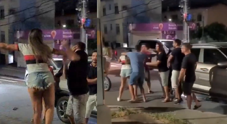 Houve confusão e a loira aparece alterada e discutindo com as pessoas, chegando a dar um tapa em um homem que tentava apartar.