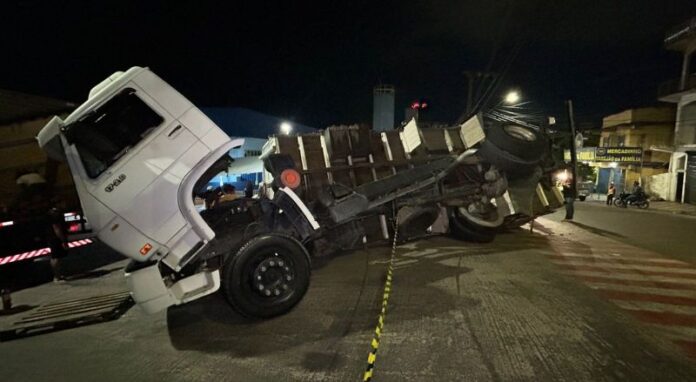 Um acidente foi registrado na noite desta quinta-feira (5) na entrada do Porto Demétrio, no bairro Educandos, Zona Sul de Manaus. Um caminhão que trafegava pela área teve a carga tombada no momento em que se aproximava do acesso ao porto.