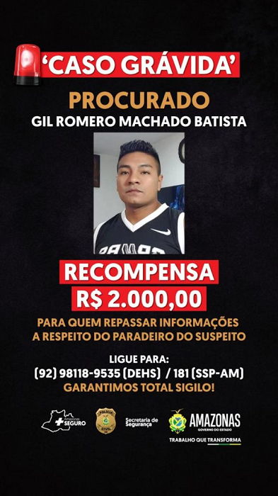 MANAUS (AM) – O procurado pela morte de Débora da Silva Alves, a jovem de 18 anos que estava grávida de 8 meses, continua sendo foragido. Gil Romero Machado Batista, de 41 anos, não aceitava a gravidez e foi apontado pela Polícia Civil do Amazonas (PC-AM) como principal suspeito. Uma recompensa de R$ 2 mil é oferecida para quem tiver informações sobre o homem.