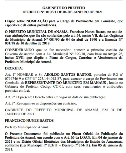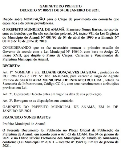 Aroldo Santos Bastos, que seria primo do prefeito, e foi lotado no cargo de ‘Representante do Município em Manaus’, com um salário de R$ 2,8 mil. Flávia Nunes Batalha Uribe, que seria a sobrinha, foi nomeada para o cargo de ‘Agente Político’ na Secretaria Municipal de Assistência Social. Além dela, uma suposta prima de segundo grau de Chico do Belo, a Elijane Gonçalves da Silva, também foi nomeada para cargo de ‘Agente político’, mas da Secretaria Municipal de Infraestrutura.