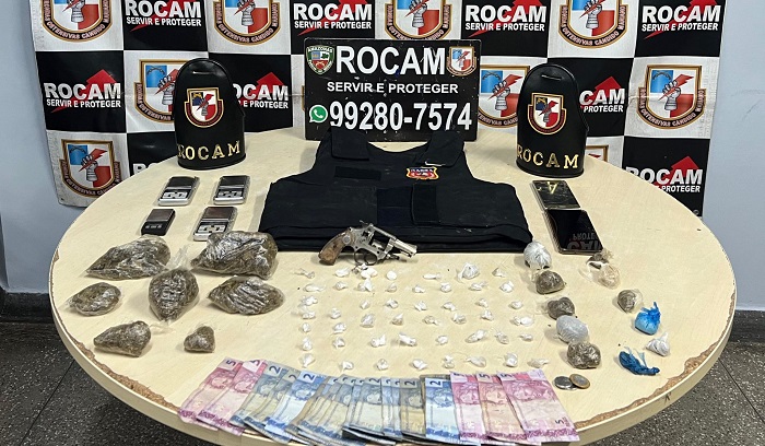 Nas buscas na área foi encontrado um suspeito, que estava usando colete balístico. Na revista pessoal foi encontrado com ele, duas bolsas tipo tiracolo com uma arma de fogo, tipo revólver, calibre 22, uma capa com placa balística, nove porções pequenas de maconha; oito trouxinhas de cocaína; três porções pequenas de oxi; 43 trouxinhas de oxi; dois aparelhos celulares, quatro balanças de precisão e dinheiro no valor de R$52,00.