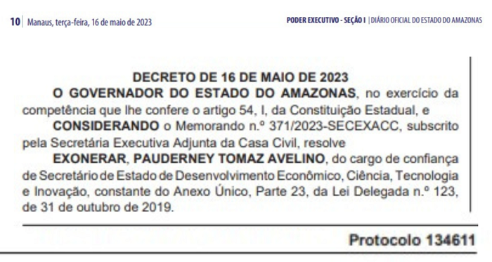 Texto do decreto, assinado pelo governador Wilson Lima, determina a exoneração de “Pauderney Tomaz Avelino, do cargo de confiança de Secretário de Estado de Desenvolvimento Econômico, Ciência, Tecnologia e Inovação, constante do Anexo Único, Parte 23, da Lei Delegada n.º 123, de 31 de outubro de 2019”.