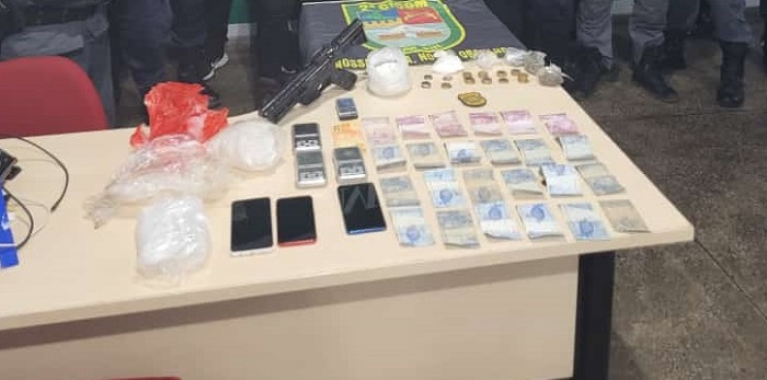 Na revista pessoal, foram encontradas três porções de maconha, do tipo skunk; duas porções de cocaína; e uma de oxi, além de um simulacro de arma de fogo; balanças de precisão e dinheiro.