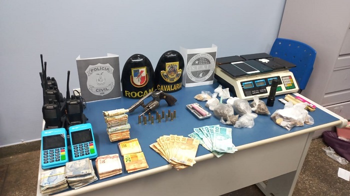 Durante abordagem e revista pessoal foram encontrados um revólver calibre 38, porções de maconha, cocaína e oxi. Também foram encontrados dentro da casa, quatro rádios comunicadores e uma quantia de R$ 6 mil em espécie.