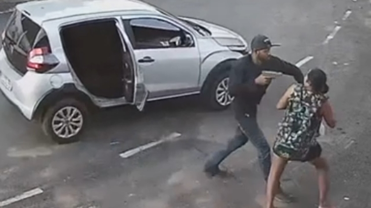 Uma câmera de segurança flagrou a ação dos criminosos. Um dos suspeitos desceu do carro armado e assaltou uma senhora que passava pelo local, levando seu celular.
