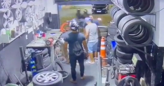 Dupla invade borracharia, mata homem e verdadeiro alvo é baleado na perna; vídeo