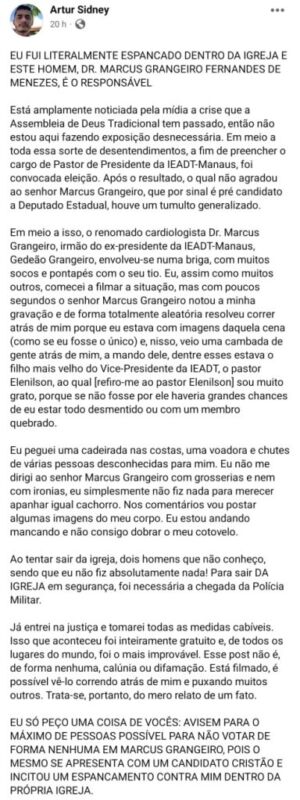 Um homem identificado como sendo Artur Sidney, frequentador da Igreja Assembleia de Deus Tradicional de Manaus, afirmou em suas redes sociais que foi agredido pelo pré-candidato a Deputado Estadual, o cardiologista Marcus Grangeiro.