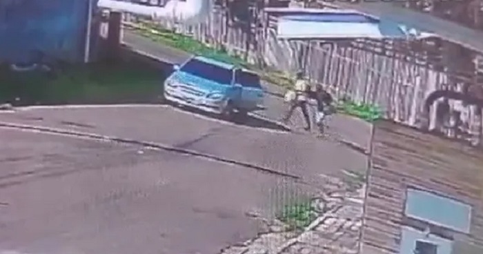 Por meio das imagens de segurança capturadas por uma vizinha, foi possível flagrar dois suspeitos entrando em um carro prata do modelo Corsa Classic para fugir.
