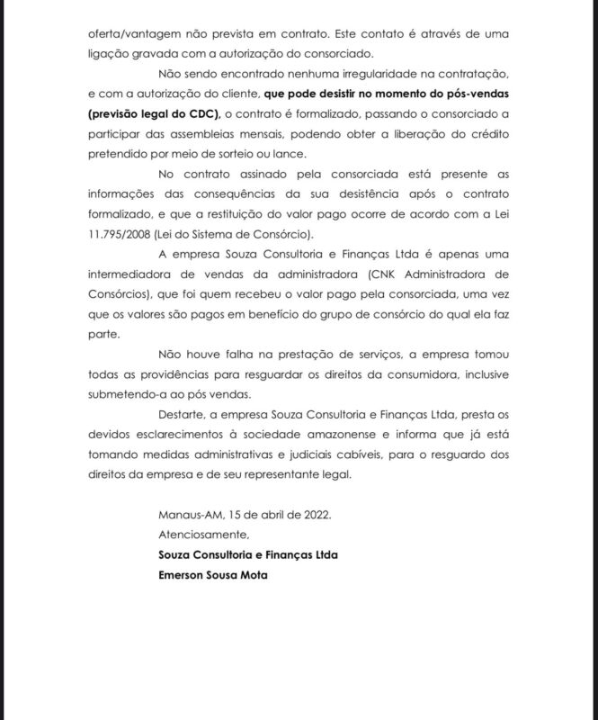 O empresário, que é representante da empresa Souza Consultoria e Finanças Ltda, foi apenas a intermediária na contratação de um plano de consórcio pela dona Isian, que entregou o valor questionado no vídeo, para a empresa CNK Administradora de Consórcios, não tendo o senhor Emerson Sousa Mota, qualquer responsabilidade neste caso.