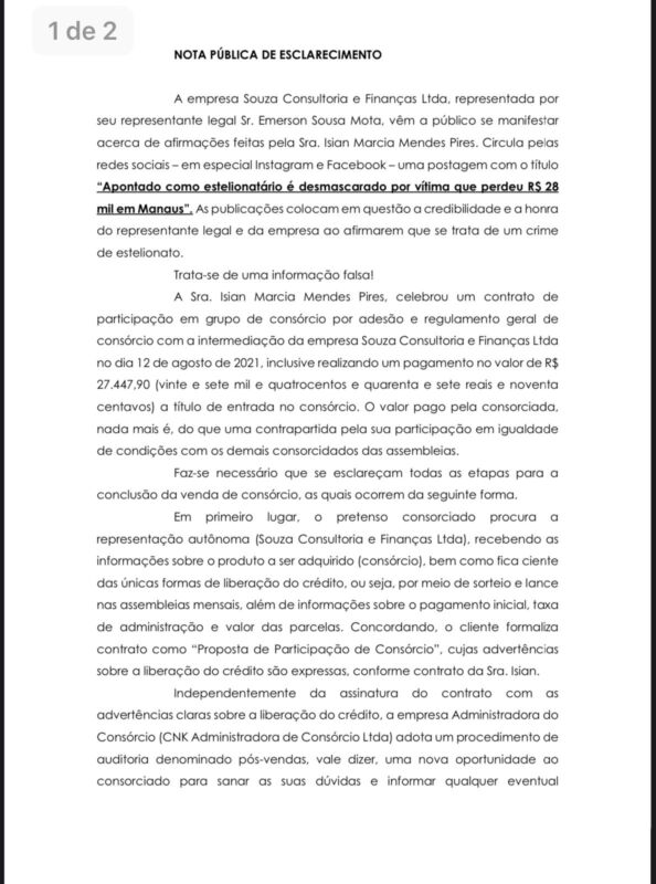 A acusação é realizada pela senhora Isian Márcia Mendes Pires, circula pelas redes sociais com um vídeo que se intitula: “Apontado como estelionatário é desmascarado pela vítima que perdeu R$28 mil em Manaus”. As publicações colocam em xeque a credibilidade e a honra de Emerson Sousa Mota, que emitiu a nota esclarecendo os fatos.
