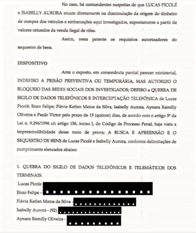 Ex-namorada do blogueiro Lucas Picolé e com ficha na polícia, a blogueira Aynara Ramilly está na mira dos investigadores. Ela teve o sigilo quebrado, após novas apurações da Operação Dracma identificarem uma conversa entre Mano Queixo e Paulo Victor Monteiro Bastos, ex-marido da influencer Isabelly Aurora, todos presos pela polícia suspeitos de faturar milhões em rifas ilegais no Amazonas.