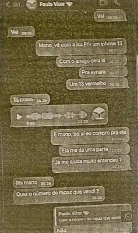 Na conversa os dois querem comprar um iPhone por meio de Isabelly Aurora, para que ela repasse para Aynara realizar o sorteio. Os prints da conversas que você vê abaixo foram usados como provas para o pedido de quebra. Feito o sorteio, ela daria parte da grana aos presos pela Operação Dracma.