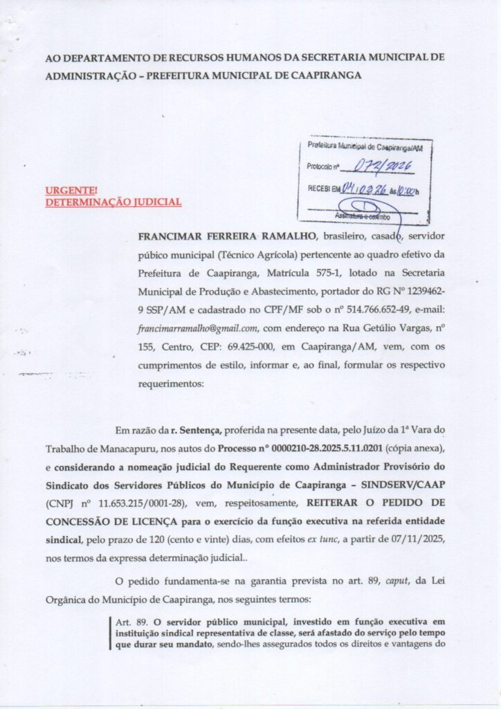 Outro ponto que levanta questionamentos é a formalização do pedido de afastamento. Embora o documento indique que a solicitação de licença foi feita em 7 de novembro de 2025, o protocolo junto à Secretaria Municipal de Administração só teria sido registrado em 4 de fevereiro, sob o número de processo 000210-28.2025.5.11.0201.