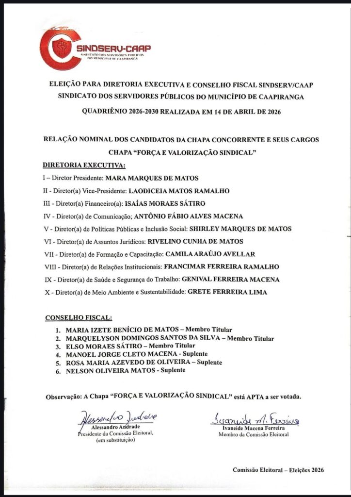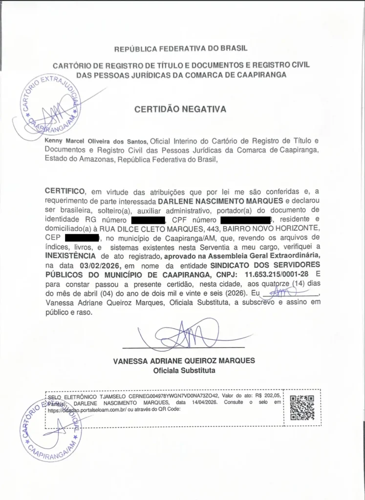 As denúncias também apontam para uma possível alteração do estatuto do sindicato sem a participação dos mais de 600 servidores efetivos do município. Segundo os relatos, o documento não teria sido apresentado à categoria nem registrado em cartório, o que levanta dúvidas sobre sua validade.