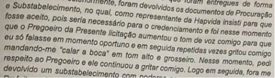 Para além, minutos após o início da sessão, o Pregoeiro tratou de forma desrespeitosa a representante da Hapvida, com gritos e desrespeitos, persistindo tal conduta durante toda a sessão de maneira arbitrária, ignorando as regras mínimas do processo licitatório, conforme descrito em ata, observa-se: