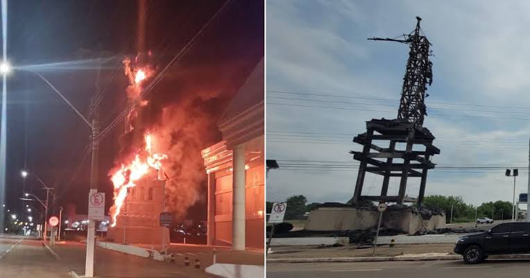 Em poucos minutos, a estátua, que tinha 40 metros de altura, foi consumida pelas chamas. Apenas a parte metálica, da estrutura do monumento, ficou de pé.