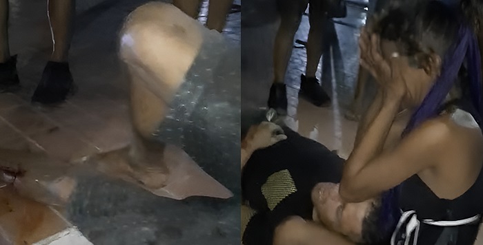 “Tá todo quebrado, dois braços quebrados, perna quebrada”, diz a mulher que filma o rapaz.