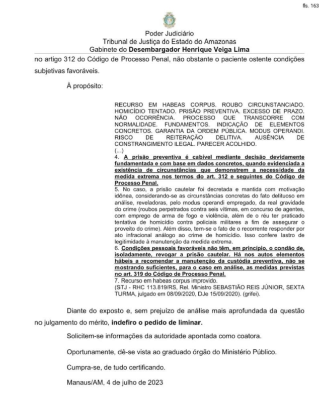 O desembargador do Tribunal de Justiça do Amazonas (TJAM), Henrique Veiga Lima, negou pedido de liberdade aos influenciadores digitais João Lucas da Silva Alves, 24, conhecido como Lucas Picolé e Enzo Oliveira, conhecido como “Mano Queixo”, presos na Operação Dracma, deflagrada pela Polícia Civil do Amazonas, contra um esquema fraudulento de venda de rifas clandestinas que movimentou mais de R$5 milhões, e outros crimes em Manaus.