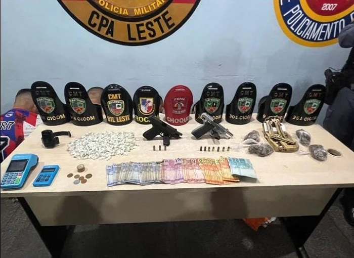 Com os infratores também foram apreendidos 1 Pistola Taurus 58, calibre 380; 1 Pistola Sig Sauer 9mm; 7 cartuchos não deflagrados calibre 380; 3 cartuchos não deflagrados calibre 9mm; 210 trouxinhas de substância supostamente entorpecente (oxi); 4 porções de substância supostamente entorpecente (maconha); 2 máquinas de cartão débito/crédito; 421 reais em espécie; 11 pacotes de seda.