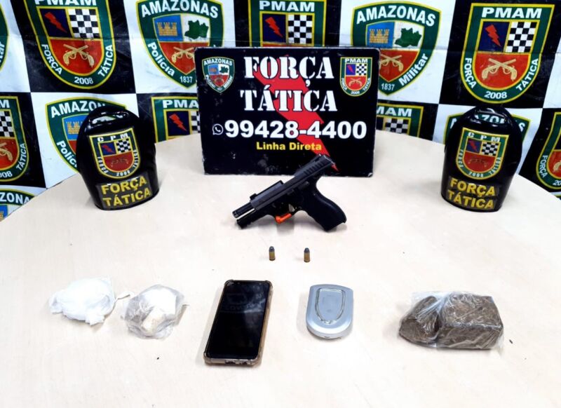 Com ele foi encontrada uma pistola, um carregador de pistola, duas munições ponto 40 e porções de maconha e oxi, além de uma balança de precisão. O suspeito recebeu voz de prisão em flagrante e o material foi apreendido
