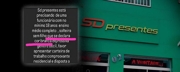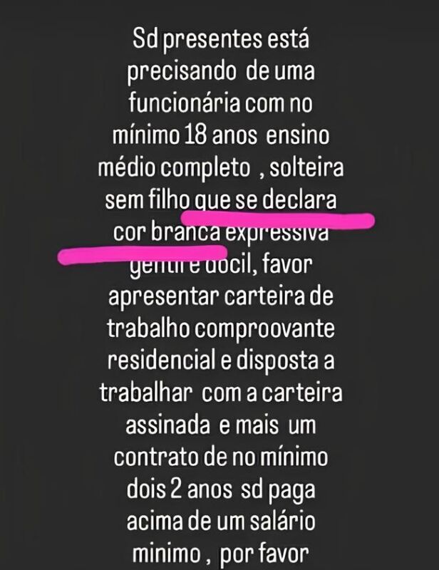 Uma loja do município de Caetité, no sudoeste baiano, publicou na quinta-feira (25) um anúncio de vaga de emprego que exigia candidata solteira, sem filhos e que se declarasse de cor branca, além de ser gentil e dócil. A postagem gerou repercussão entre os internautas, que acusam a loja de racismo, misoginia e machismo.