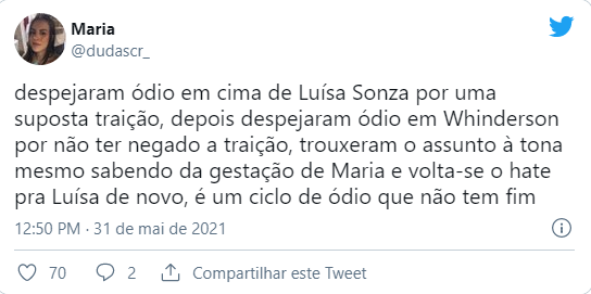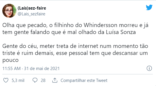 Em contrapartida, alguma pessoas defenderam Luísa, pedindo inclusive respeito pela dor da perda do casal Whindersson e Maria Lina.