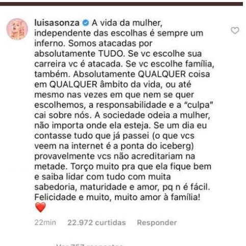 Luísa Sonza chegou a defender o casal em uma publicação quando o namoro dos dois chegou na mídia.