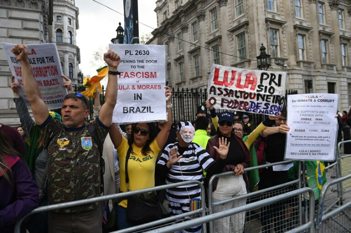 Dezenas de brasileiros estiveram em Londres, nesta sexta-feira (5), na porta do escritório do primeiro-ministro britânico, Rishi Sunak, para protestar contra o presidente Lula (PT), que cumpre agenda na Inglaterra.