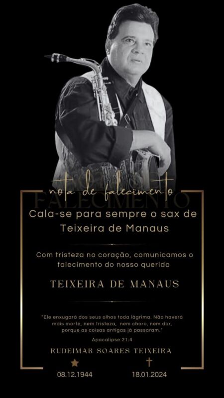 O músico amazonense Rudeimar Soares Teixerira, 80, conhecido como ‘Teixeira de Manaus’, morreu nesta quinta-feira (18), em Manaus. Teixeira de Manaus lutava contra um câncer na hipófise (responsável pelo controle da maioria das outras glândulas). Músico estava internado desde a semana passada, em uma Unidade de Tratamento Intensivo (UTI), na capital.