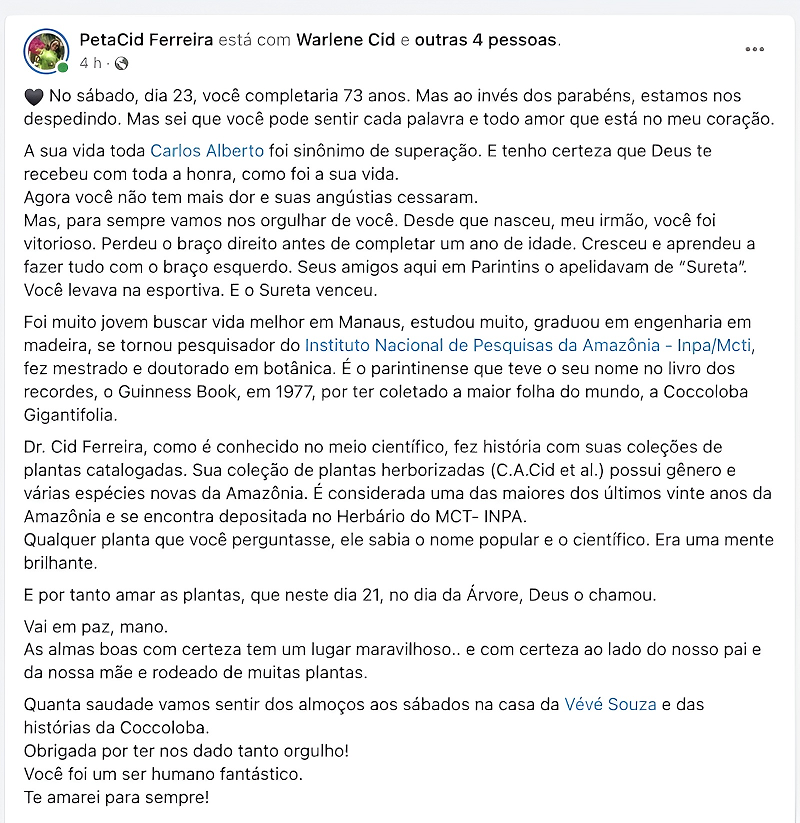 MANAUS — Familiares, amigos e pesquisadores do Amazonas e de várias partes do mundo estão em luto. Morreu em Manaus, nesta quinta-feira (21), exatamente no Dia da Árvore, o pesquisador Carlos Alberto Cid Ferreira, aos 73 anos. Ele ficou famoso após entrar para o Guinness Book, por descobrir a maior folha do mundo, que ele batizou de Coccoloba Gigantifolia, que chega a ter 2,50 metros de comprimento por 1,44 metro de largura na fase adulta.