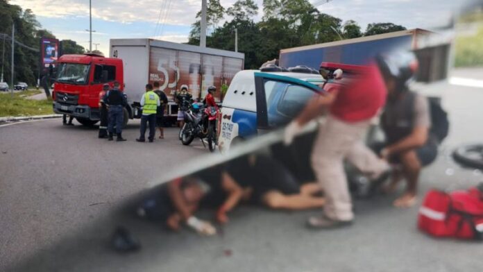 Um motociclista identificado como Mário Peixoto Farias Neto, de 36 anos, ficou gravemente ferido após se envolver em um acidente de trânsito na manhã desta segunda-feira (21), na Avenida Santos Dumont, zona Oeste de Manaus.