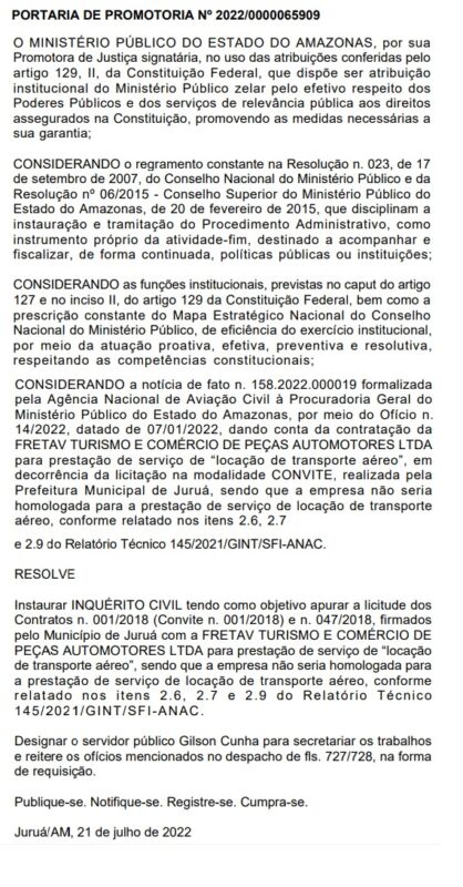 O prefeito de Juruá José Maria Rodrigues da Rocha Júnior, mais conhecido como Dr. Júnior (MDB), vai ser investigado pelo Ministério Público do Amazonas (MPAM), após o órgão instaurar um inquérito civil para apurar suspeitas em um contrato realizado para a prestação de serviço de locação de transporte aéreo no ano de 2018. A instalação do procedimento foi publicada no Diário Oficial do MP, na edição de quinta-feira (21).