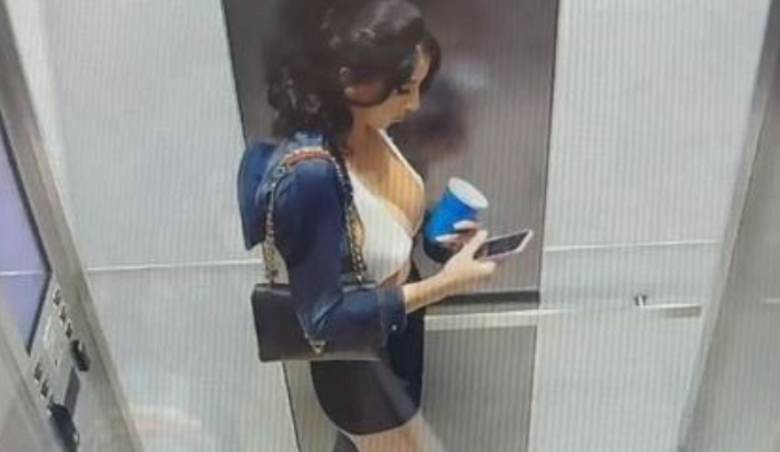 As câmeras de segurança registraram o momento em que a mulher usa o elevador do prédio. Não é possível ver onde as joias estão escondidas, mas ela aparece nas imagens carregando um copo de plástico azul.