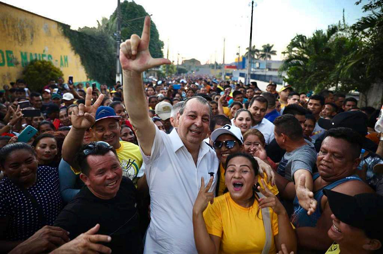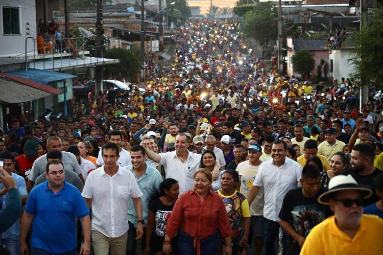 A população tomou as ruas de Maués, distante 258 km da capital, caminhando ao lado da comitiva composta ainda pelo deputado estadual Roberto Cidade (União Brasil), do pré-candidato a deputado estadual Jesus Alves (MDB) e pelo prefeito Junior Leite (União Brasil).