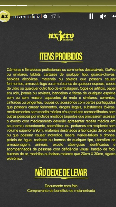 Chama a atenção a proibição óbvia de drogas ilegais, assim com de bebidas e cartazes, estes últimos normalmente levados pelo público para homenagear os artistas.