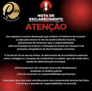 “Ontem, dia 27 de outubro, a cantora Marília Tavares se apresentou em Carauari(AM) e, em contrato, foi firmado que a prefeitura do município disponibilizaria duas aeronave às 09h da manhã para transportar a artista e sua equipe até parte do trecho (Manaus) para o show de hoje (28/10) em Novo Airão (AM), às 18h, porém o acordado não foi cumprido e a aeronave decolou no horário local das (14:30), já que não teve efetivação do acordo com a prefeitura de Carauari(AM), o que a impossibilita de cumprir o espetáculo em Novo Airão. Lamentamos o ocorrido”, diz o comunicado divulgado nas redes sociais da artistas.