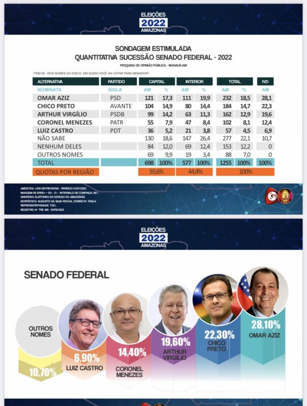 Pesquisa foi realizada entre os dias 1 e 4 de julho de 2022 com 1.255 eleitores de 13 municípios amazonenses onde estão concentrados 77,8% dos eleitores do Estado.