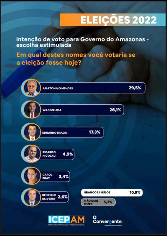 O ex-governador Amazonino Mendes, aparece liderando a pesquisa com 29,5%, e o atual governador Wilson Lima, desponta com 26,1% da intenção de votos dos eleitores. A consulta, relacionada a pesquisa estimulada, quando os nomes dos candidatos são apresentados aos entrevistados, mostrou ainda que o senador Eduardo Braga (MDB) aparece como a terceira opção dos eleitores, ficando com 17,3% do intuito dos votos.