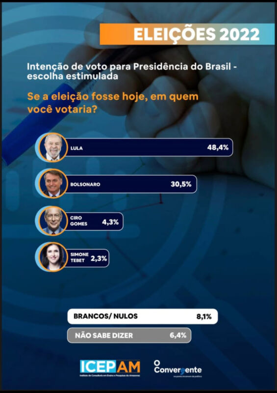 Além de avaliar o cenário eleitoral para o Governo do Amazonas para o primeiro turno, a pesquisa do ICEPAM também avaliou a intenção dos eleitores quanto os pré-candidatos à Presidência da República, também para o primeiro turno.