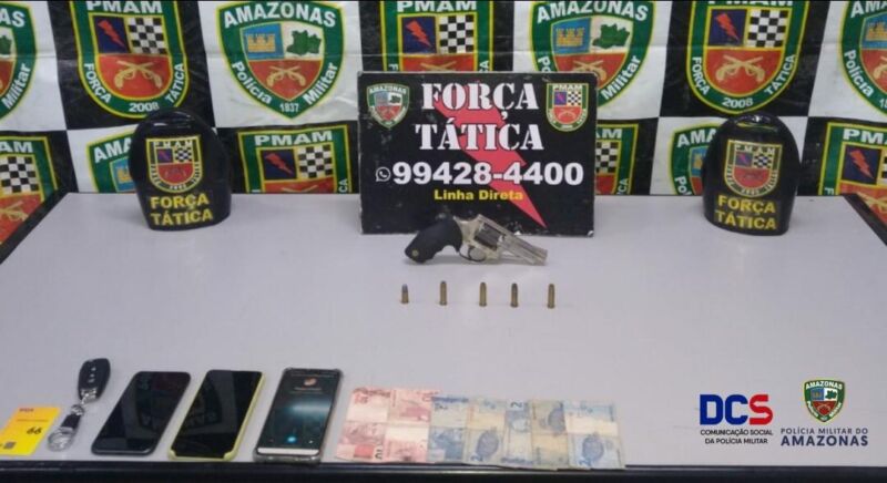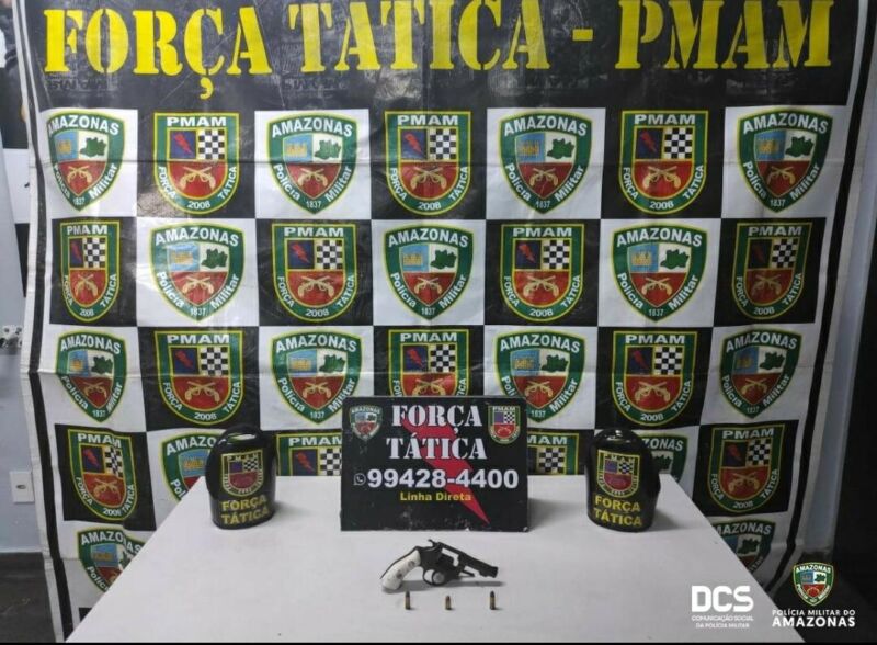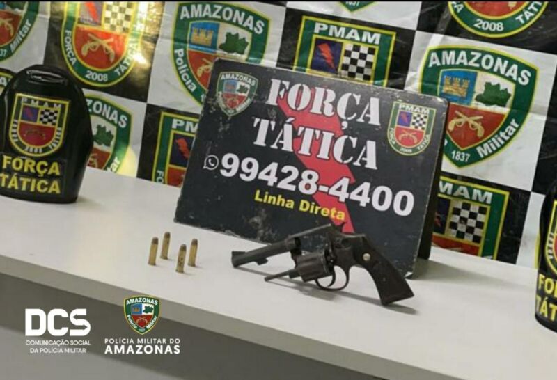 Durante a noite, por volta das 21h40, uma outra equipe da Força Tática estava em patrulhamento pela rua Ayres de Almeida, bairro Raiz, quando avistou um homem, de 23 anos, em atitude suspeita. Feita a abordagem, com o jovem a polícia localizou um revólver calibre 32, juntamente com três munições intactas. Foi dada voz de prisão ao indivíduo, que juntamente com o armamento, foi apresentado ao 1° DIP para procedimentos cabíveis.