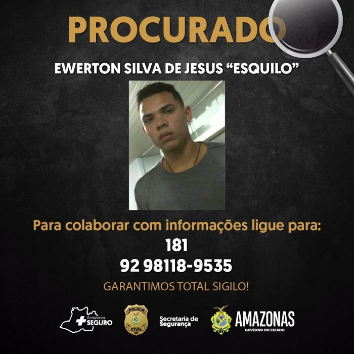 Manaus – A Delegacia Especializada em Homicídios e Sequestros (DEHS), da Polícia Civil do Amazonas (PC-AM), solicita ampla divulgação da imagem de Ewerton Silva de Jesus, 24, conhecido como “Esquilo”, por envolvimento na morte do vereador do município de Tabatinga, Olímpio Guedes Olavo Júnior. A vítima tinha 30 anos, e o crime ocorreu no dia 12 de maio de 2022, no bairro Flores, zona centro-sul de Manaus.