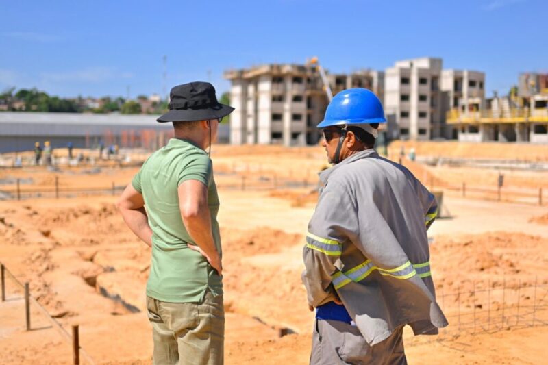 O prefeito de Manaus, David Almeida, fiscalizou, na manhã desta terça-feira, 5/8, o andamento das obras do conjunto habitacional que está sendo erguido próximo da avenida do Turismo, na zona Oeste da capital. O empreendimento vai contemplar 576 famílias. Com a intensificação do verão amazônico, a obra está avançando na construção dos três edifícios, no estágio de terraplanagem e alcançando os 20% de andamento.