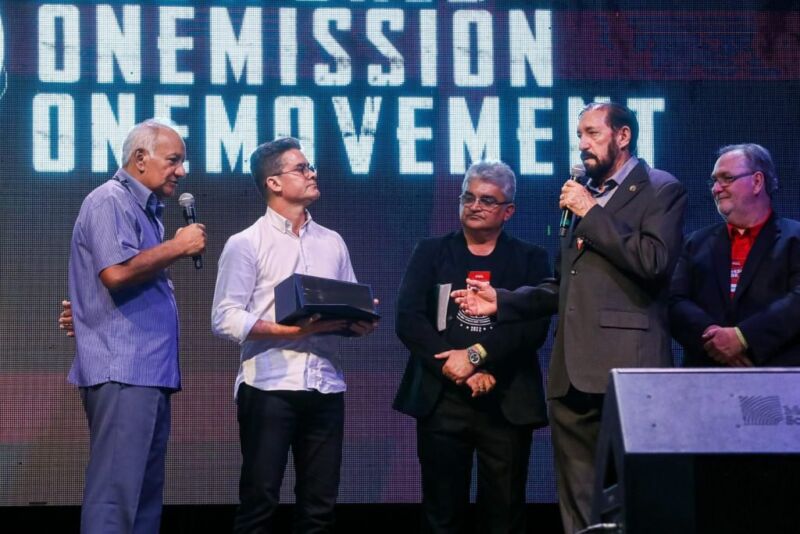 Acompanhado pelo vereador e vice-presidente da Câmara Municipal de Manaus (CMM), Wallace Oliveira, o prefeito David Almeida foi homenageado com um troféu pelo pastor Francisco Montefusco, presidente da igreja no país, e destacou a importância de eventos para Manaus.