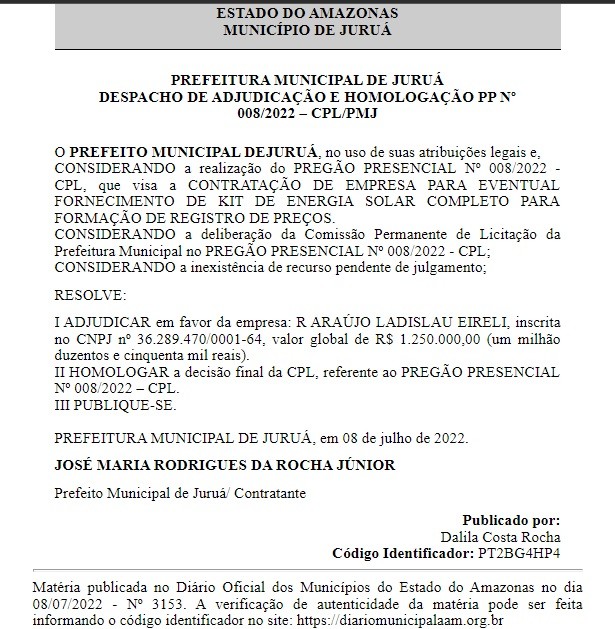 O prefeito de Juruá, José Maria Rodrigues da Rocha Júnior (MDB), pode se tornar novamente alvo do Ministério Público do Amazonas (MP-AM) por seus gastos exorbitantes com o dinheiro do município. Desta vez, ele irá gastar mais de R$ 1 milhão em kits de energia solar, conforme consta na publicação feita na última sexta-feira (8), no Diário Oficial dos Municípios do Estado do Amazonas (DOM-AM).