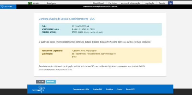 Em consulta a seu quadro de sócio e administradores a empresa tem como responsável Rubermar Araújo Ladislau e o capital social é de R$ 120 mil.